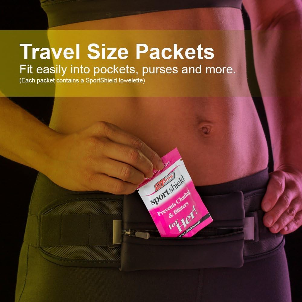 A little goes a long way. 2Toms SportShield For Her! Towelette applies formula smoothly and evenly just where you need it. SportShield for Her! creates a soothing invisible coating and protective barrier that stays on top of the skin to prevent rubbing and friction while not affecting your ability to sweat. Perfect for traveling.