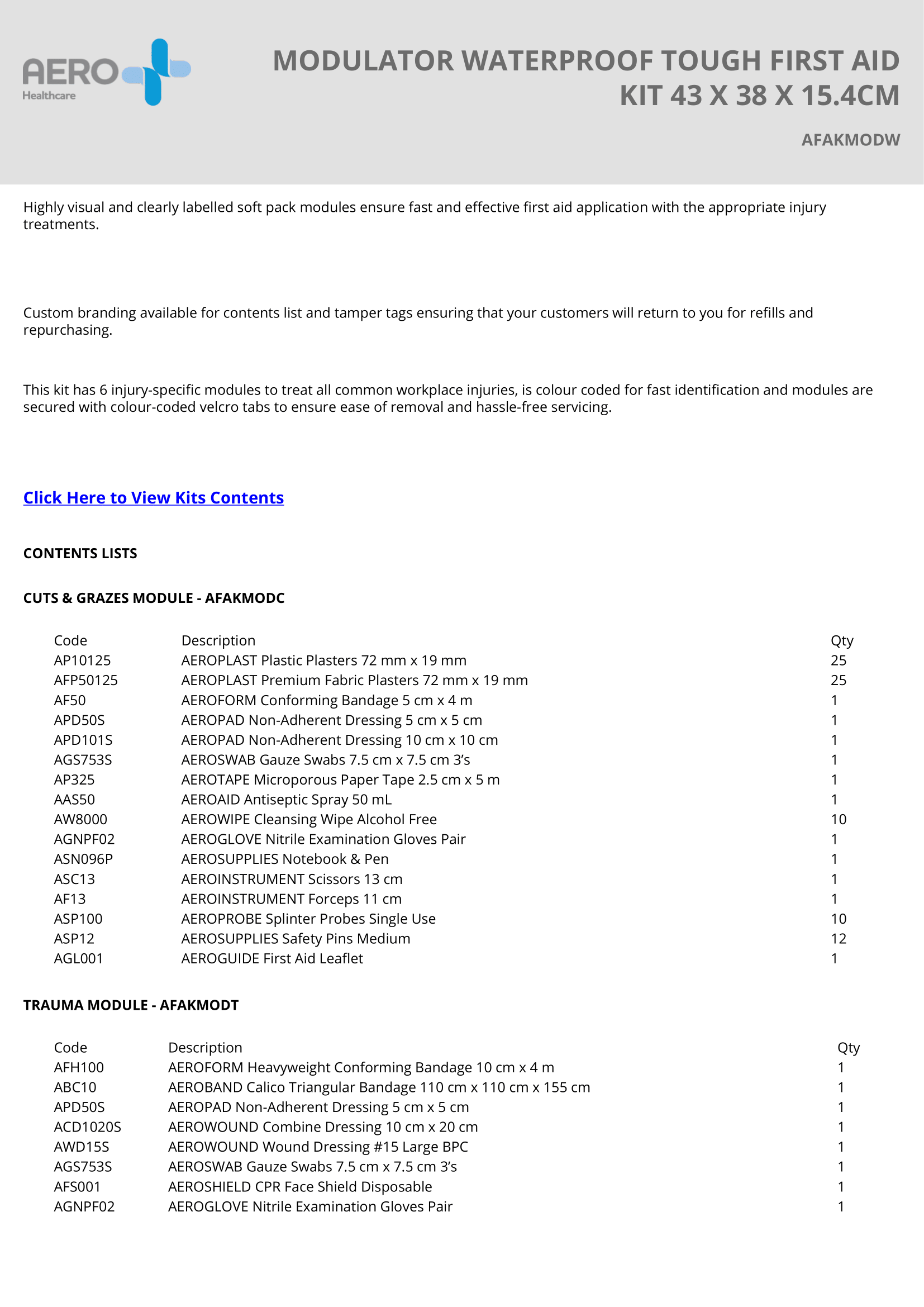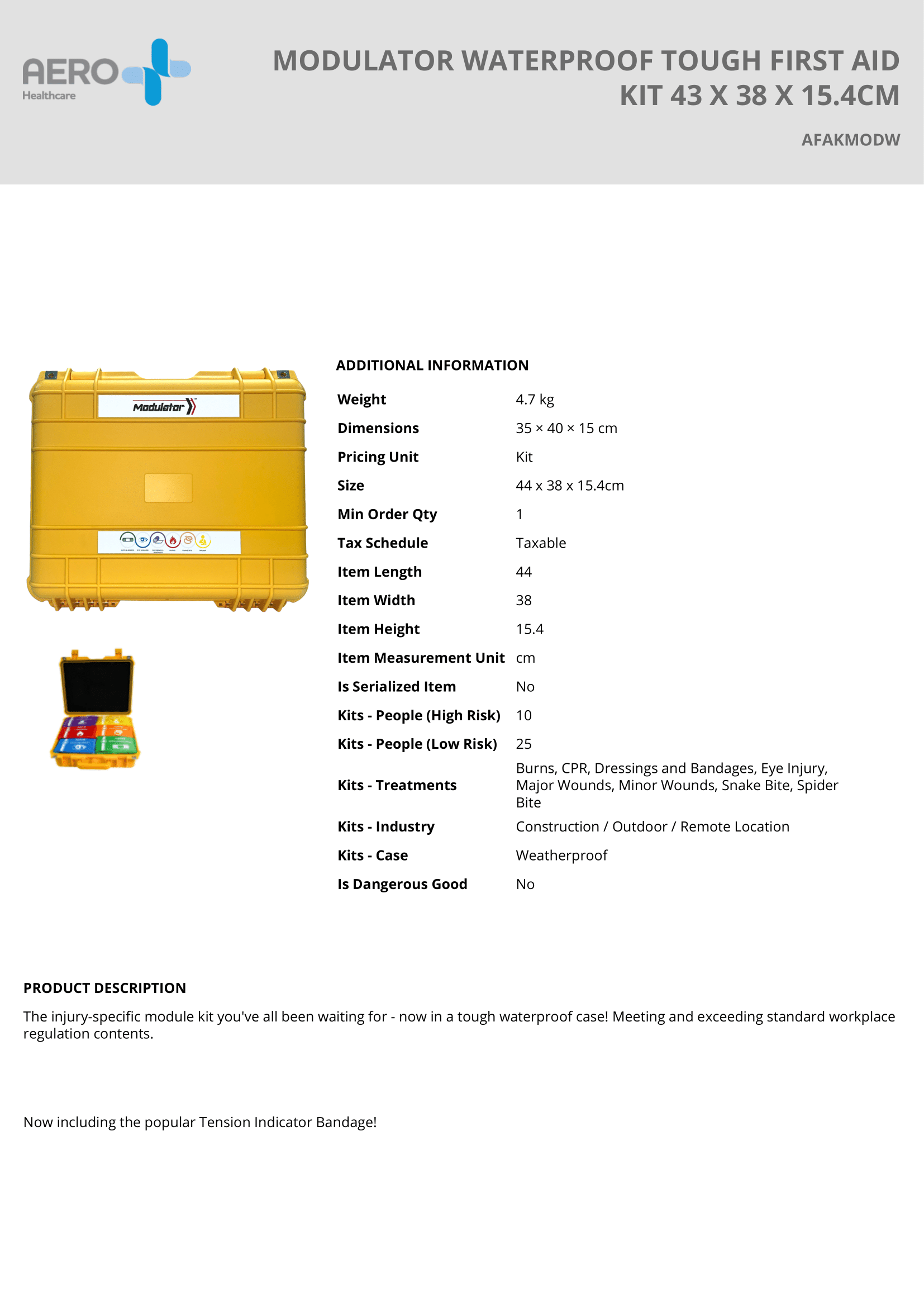 The MODULATOR Waterproof Tough First Aid Kit is a purpose-built, high-performance solution designed to meet and exceed Australian workplace safety standards. Housed in a rugged, waterproof case, this kit is ideal for construction sites, trades, industrial environments, and outdoor workspaces where reliability is non-negotiable.