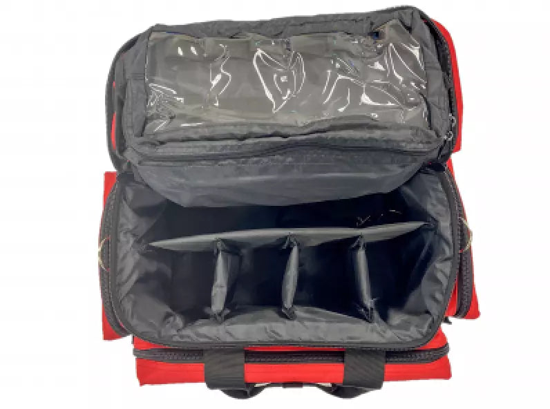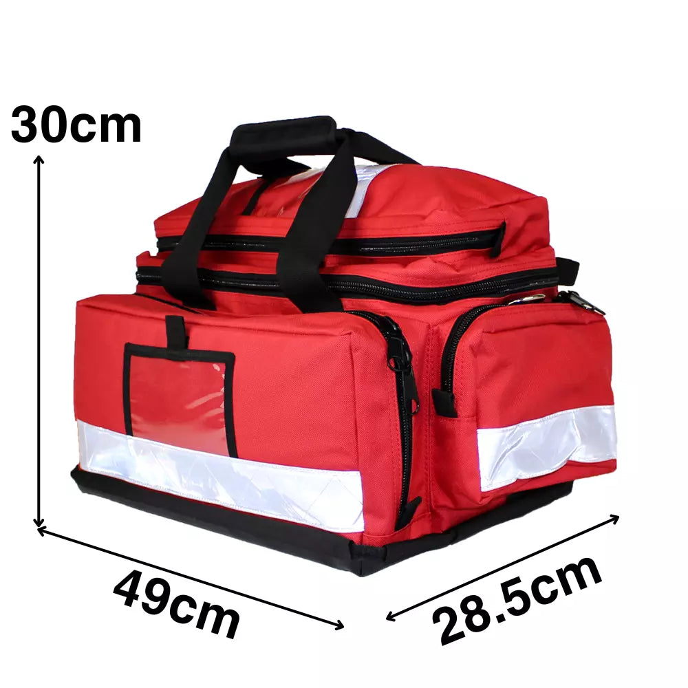 A large red trauma carry bag with reflective tape, carry handles, multiple pockets and a main compartment with dividers.