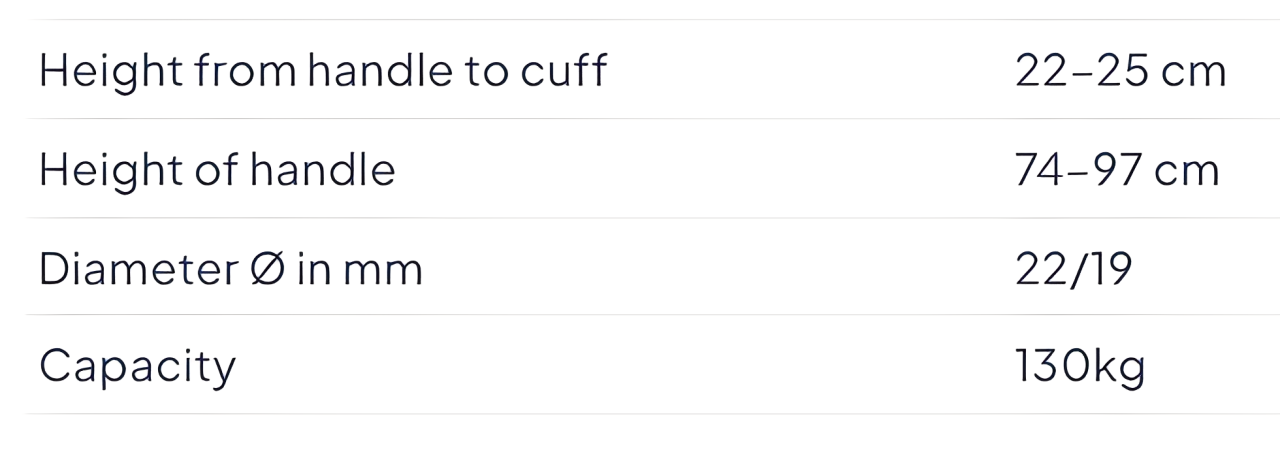 - Height Adjustable: Easily customise the crutch height from 74 cm to 97 cm, ensuring optimal fit and comfort. The handle-to-cuff height also adjusts from 22 cm to 25 cm.