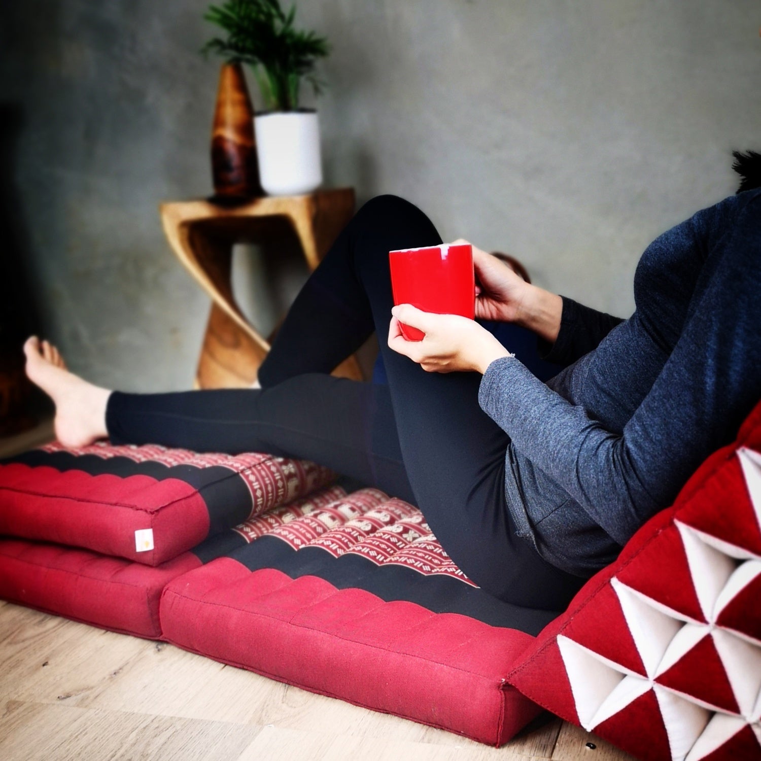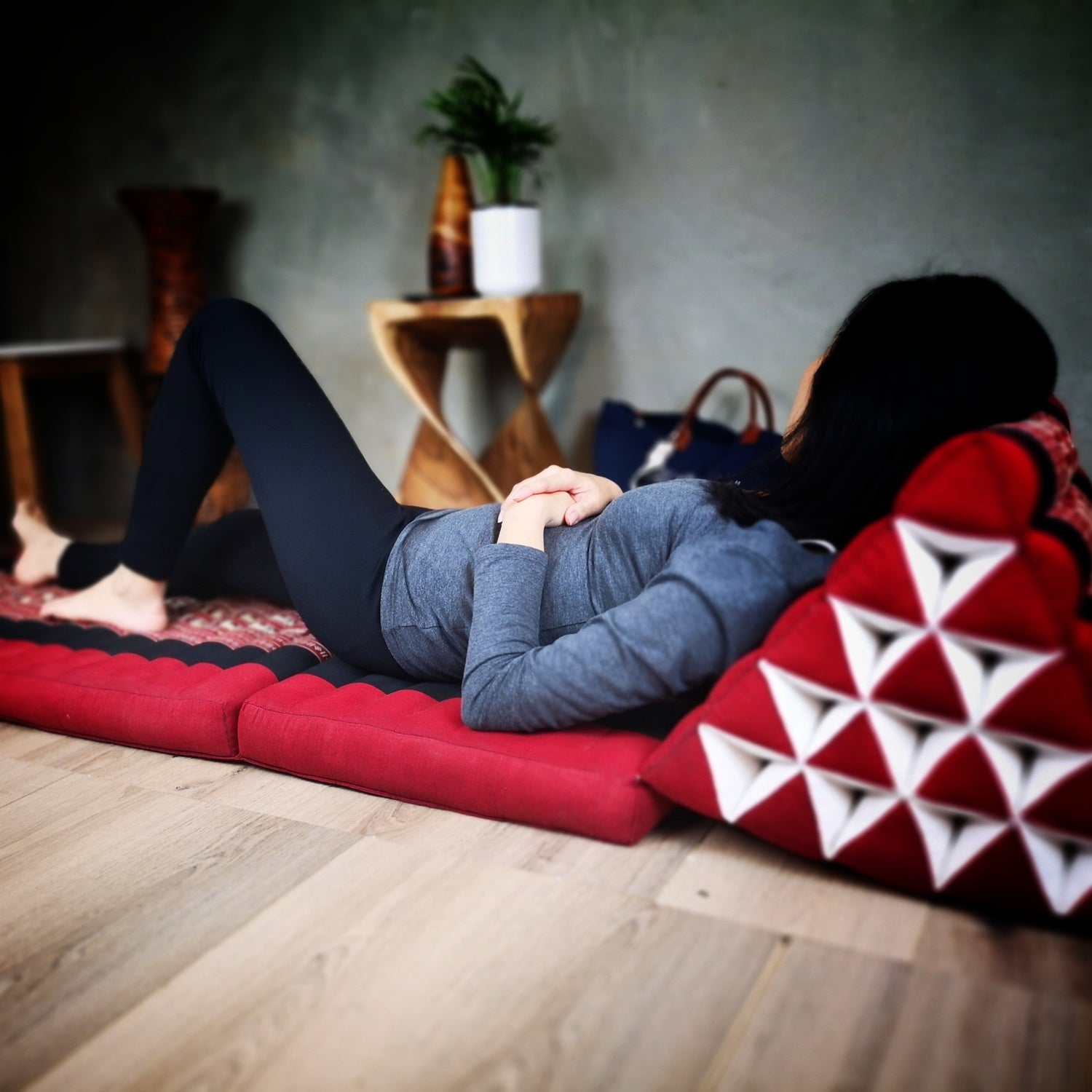 Bring a touch of Thai tradition to your home with this handmade, three-fold Thai triangle pillow. Stuffed with 100% organic kapok fibre and wrapped in durable cotton, this full-length fold-out cushion doubles as a floor lounge, daybed, meditation mat, or stylish guest mattress.