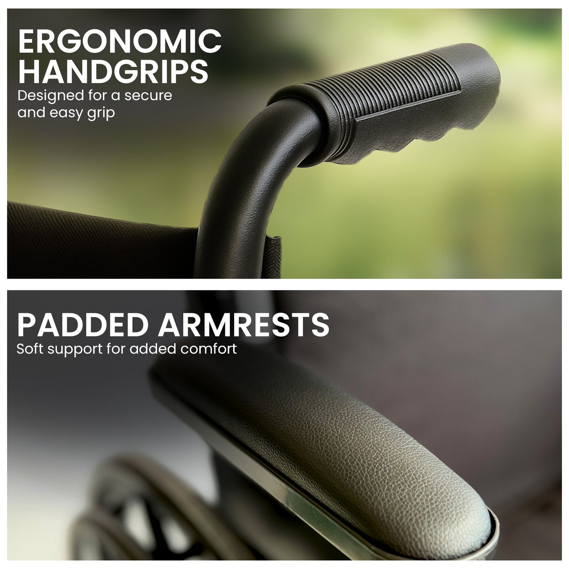 Constructed with a durable steel frame, it offers a secure ride while padded armrests and height-adjustable footrests provide added comfort during extended use. The large 24-inch rear wheels with handrims and 8-inch front PVC wheels ensure smooth navigation across indoor and outdoor surfaces.