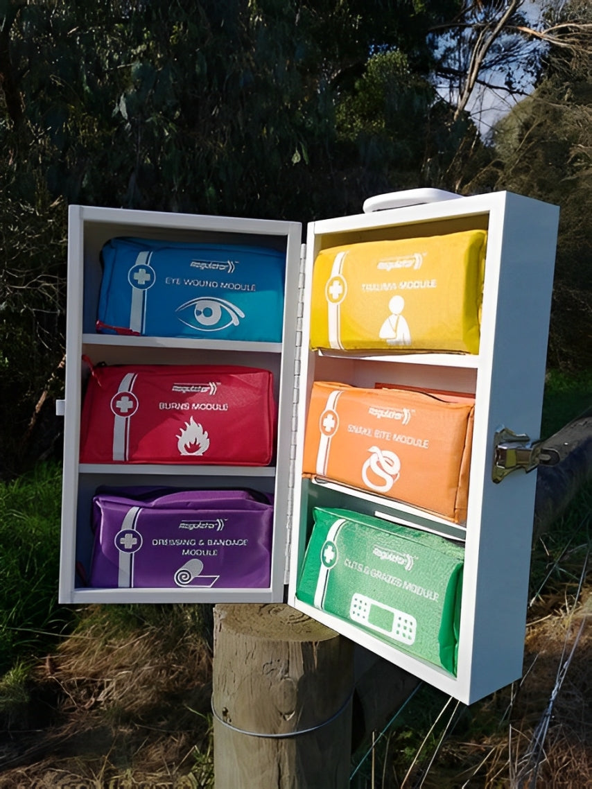 - Colour-Coded Modules: Six injury-specific, soft-pack modules—Burns (Red), Eye Wounds (Blue), Trauma (Yellow), Snake Bite (Orange), Cuts & Grazes (Green), and Dressings & Bandages (Purple)—ensure quick identification and response.