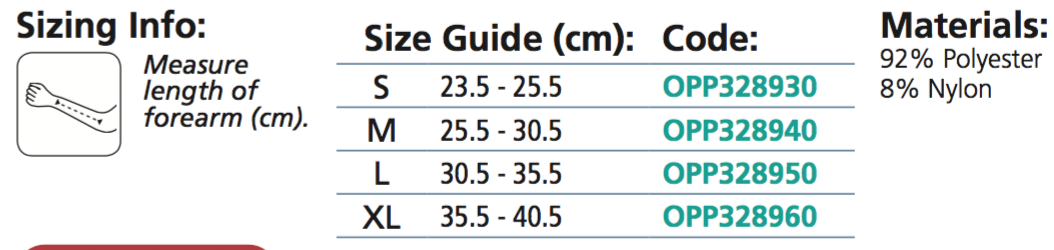 To wear, insert the forearm in the mesh pocket, position the thumb in the strap, and adjust the shoulder strap for a 90° elbow angle. Suitable for various arm lengths.