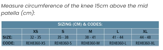 - Measure circumference of the knee 15cm above the mid patella (cm) to select the correct size.