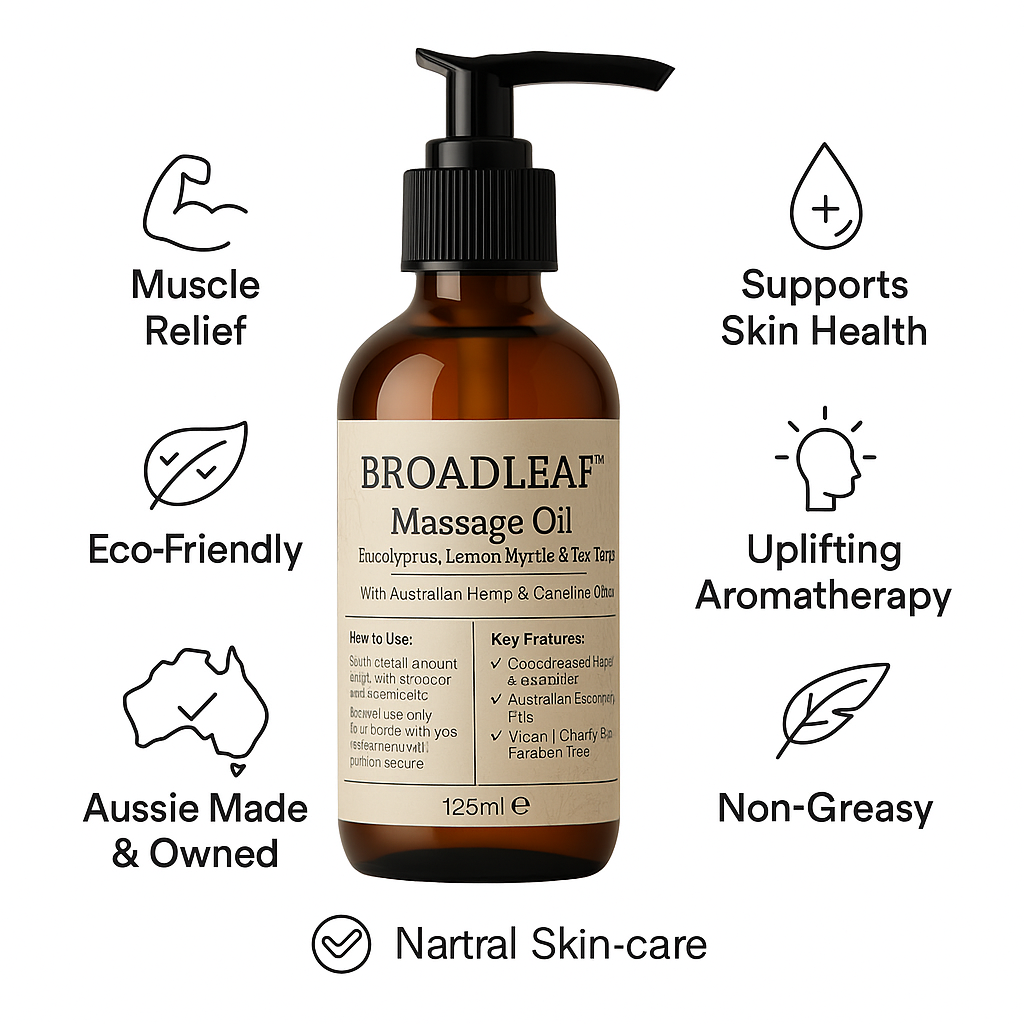 Experience the soothing touch of nature with Broadleaf™ Hemp & Camelina Massage Oil. This luxurious blend combines cold-pressed Australian hemp seed oil and camelina oil with therapeutic-grade eucalyptus, lemon myrtle, and tea tree essential oils. Designed to nourish the skin and support recovery, this fast-absorbing, non-greasy formula is ideal for deep tissue massage, spa treatments, or daily skincare routines.