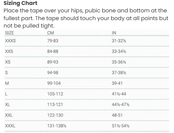 - Sizing note: the size chart measures around the hips; place a tape across the fullest part of hips and bottom, with the tape touching the body but not compressing.