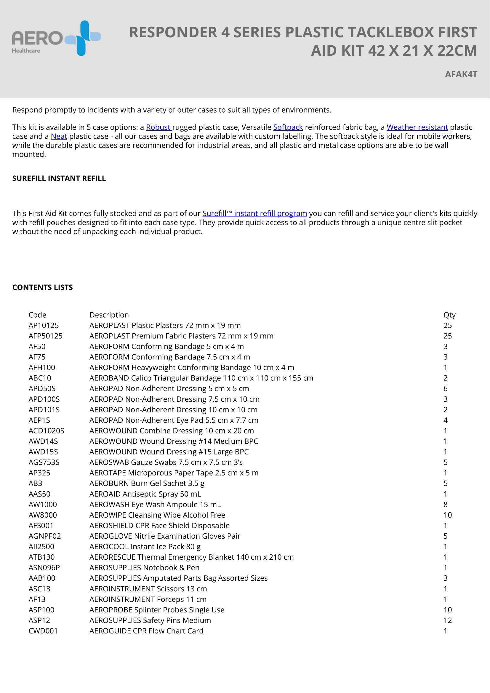 The RESPONDER 4 Series Plastic Tacklebox First Aid Kit is a durable, high-capacity workplace safety solution, specifically designed to meet Australian WHS compliance requirements. Packed with a broad range of hospital-grade medical supplies, this kit ensures you're prepared for a variety of emergencies—from cuts and abrasions to burns and sprains.