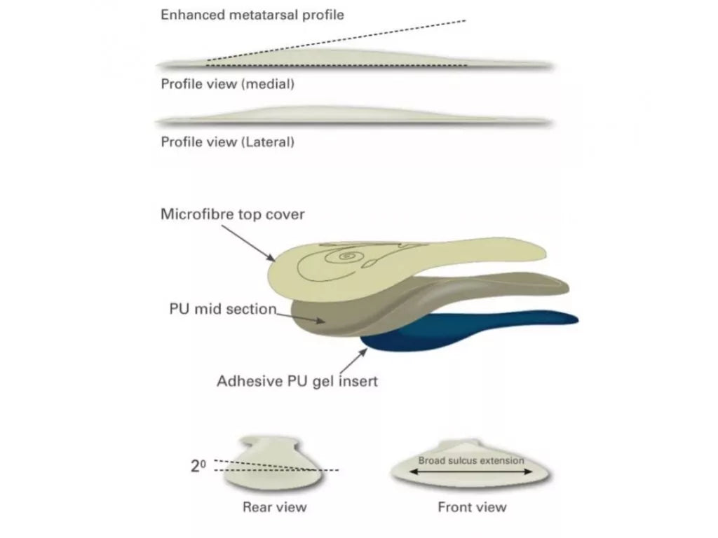 A forefoot medial wedge may be required to prevent the medial forefoot collapsing onto the forward medial arch profile of the orthotic when the foot fully loads through midstance phase.